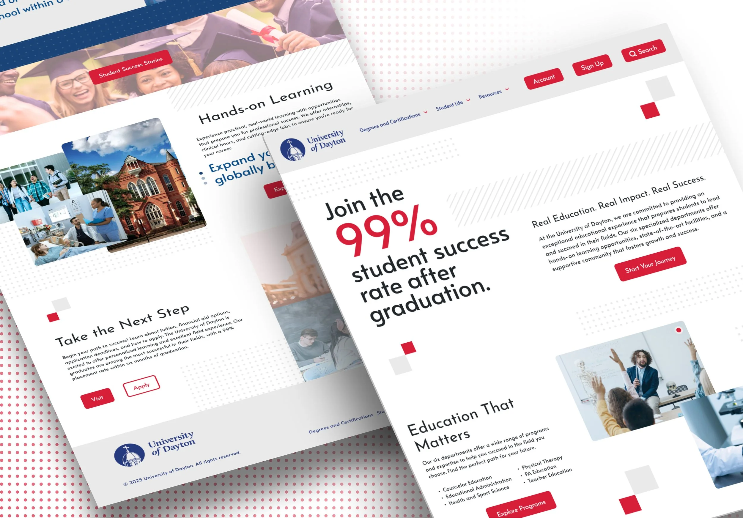 The University of Dayton’s School of Education and Health Sciences needed an engaging webpage to showcase data points and attract students and their parents. Inspired by modern design trends, I used white space and geometric patterns made of diagonal lines, circles, and squares to help the site feel smart and professional. Interactive data points highlight student success, creating a unique web experience. The fonts chosen were used to support the professional and clean look of the webpage redesign.